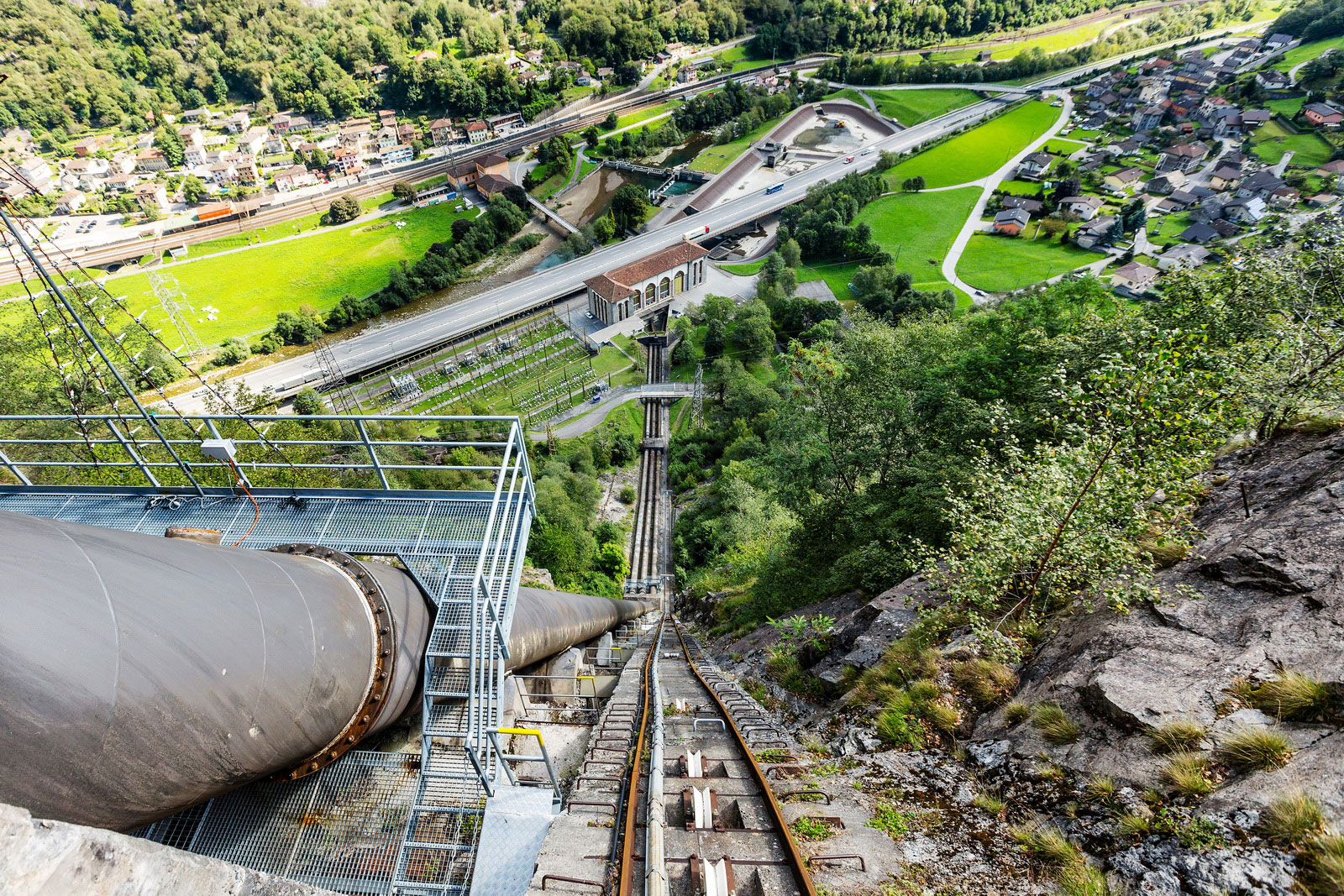 Die Rede ist von den drei Druckleitungen, durch die Wasser von der Bergkante in die Tiefe stürzt und in der Centrale Piottino in Lavorgo TI, einem Kraftwerk der Azienda Elettrica Ticinese (AET), drei Turbinen antreibt.